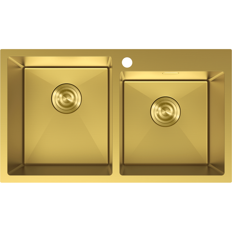 Med to kummer som lar deg vaske og skylle samtidig leverer Mexen Xorin (780 x 450 mm) en funksjonell løsning i gullfarge. Med to kummer kan du vaske og skylle samtidig uten å blande rent og skittent.